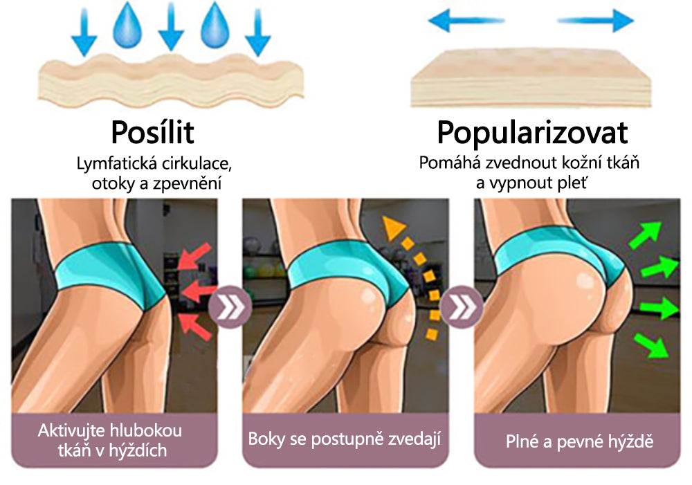 FIR (dalekoinfračervené záření) pomáhá formovat pevné a tvarované hýždě tím, že zlepšuje krevní oběh, snižuje ukládání tuku a uvolňuje svalovou únavu. Iontová terapie zvyšuje plnost a elasticitu pokožky tím, že neutralizuje volné radikály, podporuje regeneraci buněk a snižuje otoky. Tyto terapie společně zlepšují tvar hýždí, kvalitu pokožky a přispívají k celkovému zdraví.